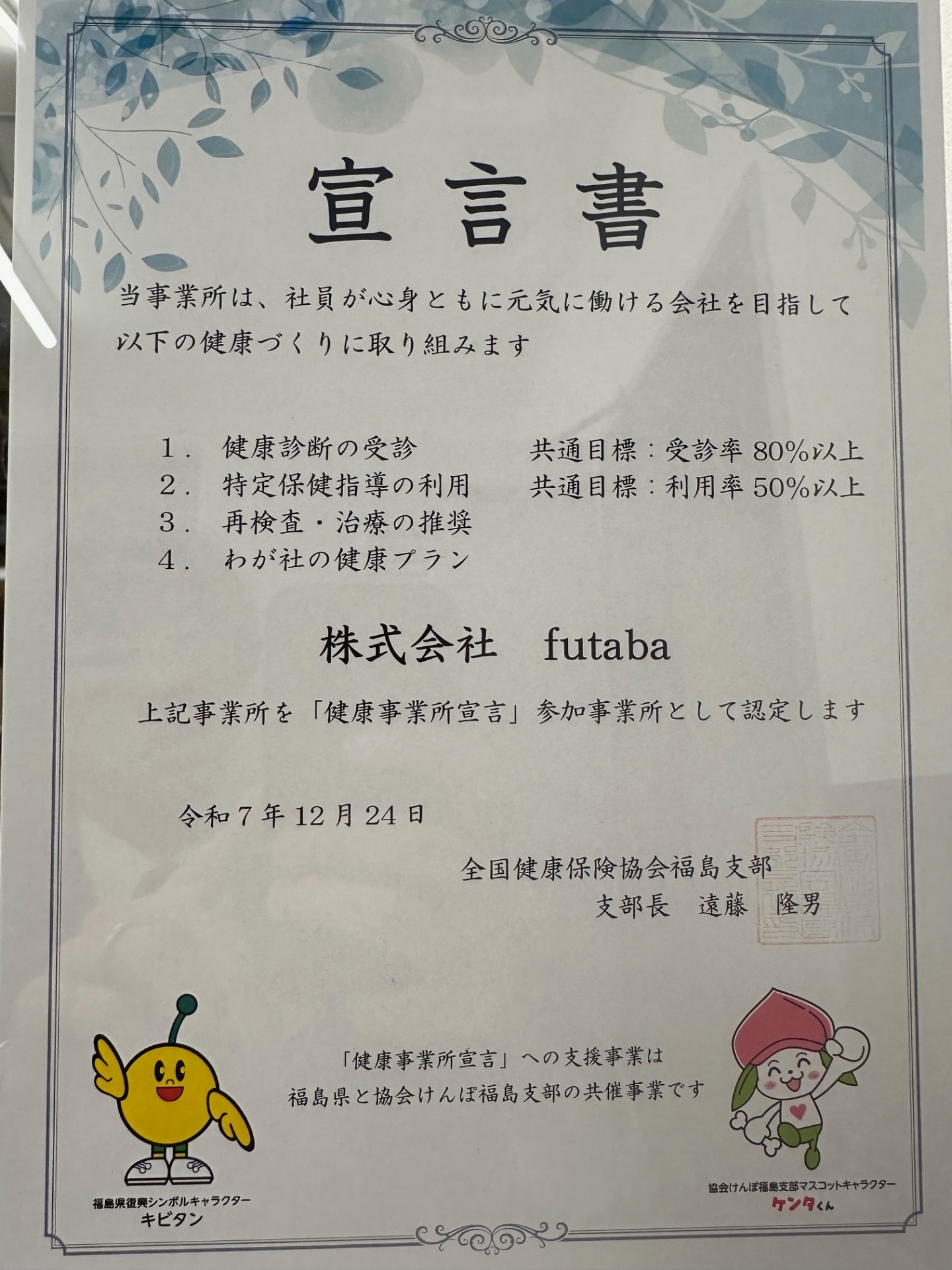 『健康事業所宣言』参加事業所として認定頂きました